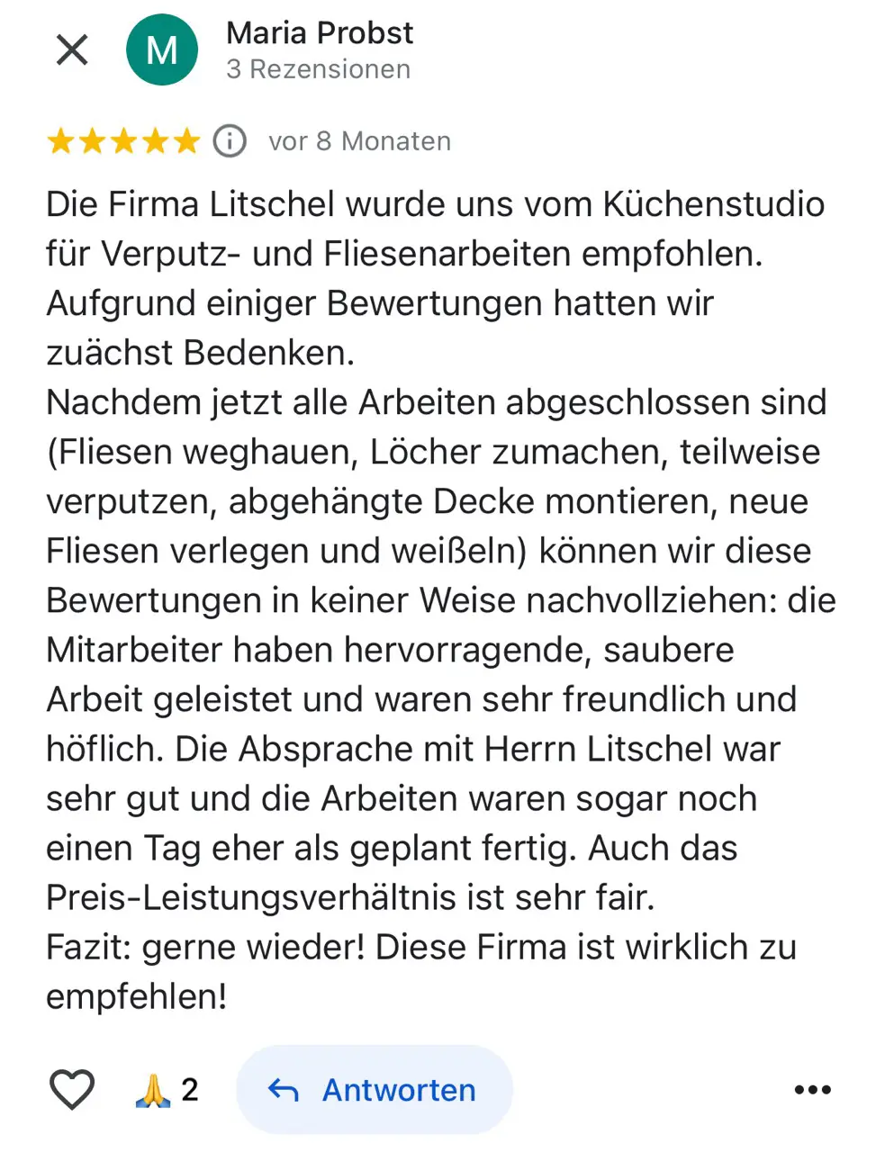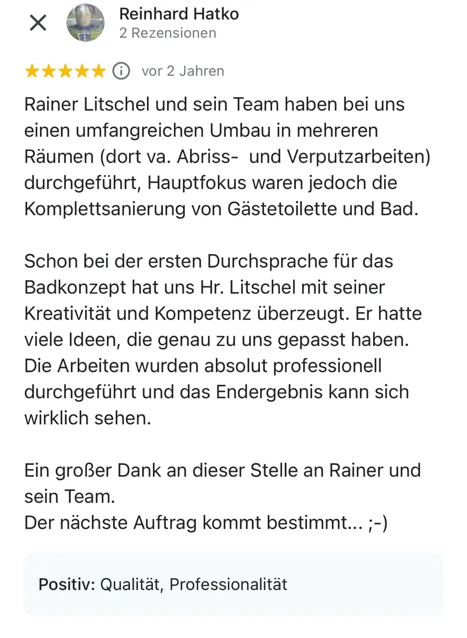 All die begeisterten Empfehlungen belegen am besten, wie ehrlich unsere Liebe zum Handwerk und die Preis-Leistung von Schirrmacher Bad & Heizung im Premiumbereich ist.